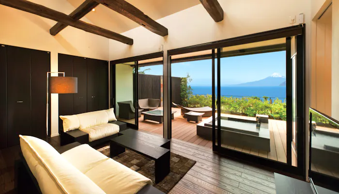 駿河湾と富士山を、室内から優雅に望めると人気の「富岳群青」。無駄を削ぎ落とした上質なインテリアは、心地よい寛ぎと安らぎを与えてくれます。テラスに備わる露天風呂から、刻一刻と変わりゆく富士の姿を一日中眺める贅沢を味わえます。