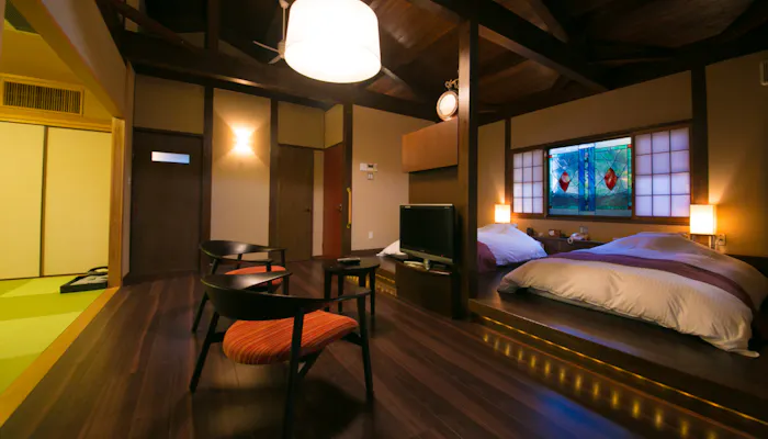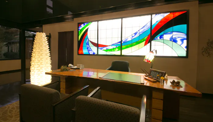 フロントやロビーは、ステンドグラスやシャンデリアが輝く洋の空間。離れは一転して古民家風の味付けがされた和モダンのデザイン。