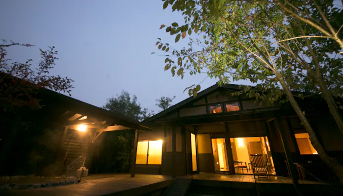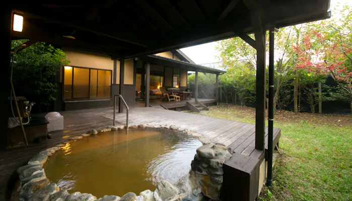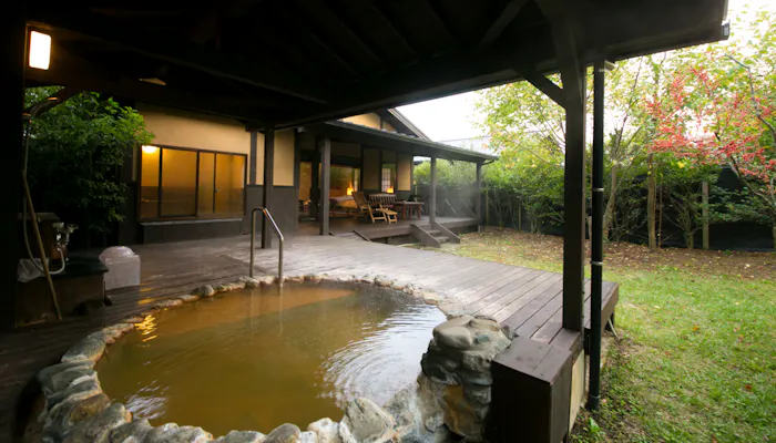 温泉は露天風呂も内湯もどちらも源泉掛け流し。世界屈指の炭酸泉で知られる「長湯温泉」とほぼ同じ泉質の、炭酸水素塩泉です。24時間入浴できるのでいつでも温泉三昧。湯に入って、ウッドデッキで涼み、また湯に入って……と、飽くほど温泉を楽しめます。