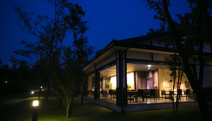 レストランへはスタッフがカートで送迎してくれます。もちろん、散策を兼ねて中庭をゆっくり歩いて向かってもOK。ガラス張りのレストランが近づくにつれ、ワクワクが増してくるはずです。