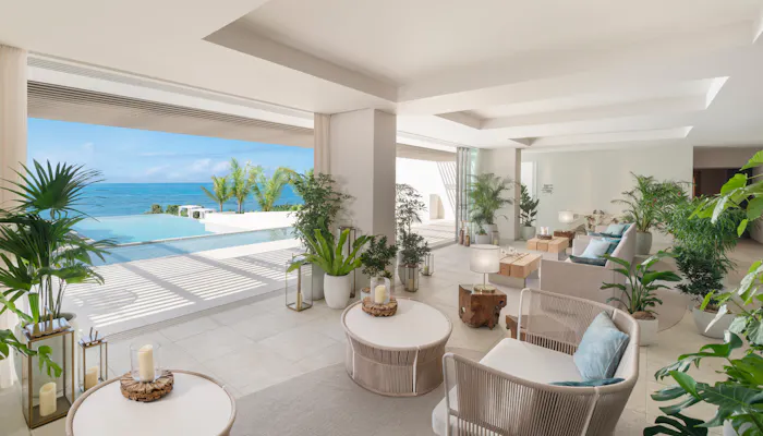 「イラフ SUI ラグジュアリーコレクションホテル 沖縄宮古」があるのは、人気リゾート地・宮古島から大きな橋を渡った先にある伊良部島。美しいサンゴ礁のビーチに面した海岸線に立地しています。外観だけでなく、建物内も白を基調としたデザインで統一。“伊良部ブルー”の海とのコントラストが、爽やかな雰囲気を演出しています。
