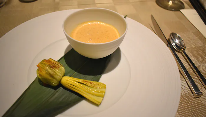 ビスクは、下半分ほどが茶碗蒸しのようになっています。花ズッキーニの中には、細かく切られたすっぽんがたっぷり。