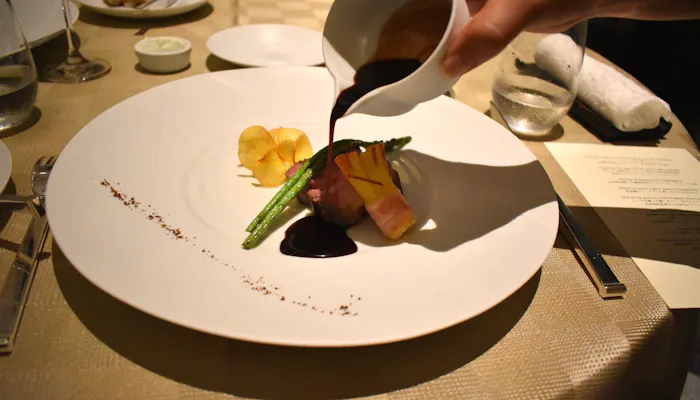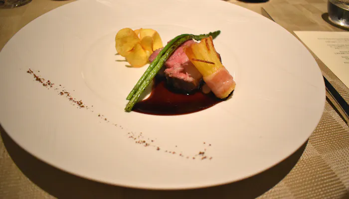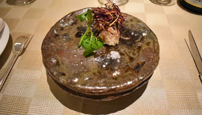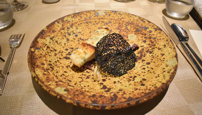 皮目がパリパリに焼かれたスズキに添えられるのは、西表島産黒紫米と山ウドのリゾット。ほんのり海苔が香り、和を感じるお皿です。