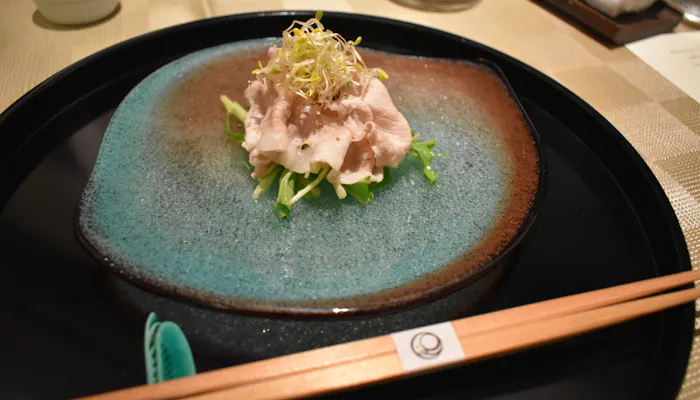 沖縄固有の貴重なアグー豚は非常に柔らかく調理されており、噛んでいると特有の旨味と甘味が口の中に広がっていきます。
