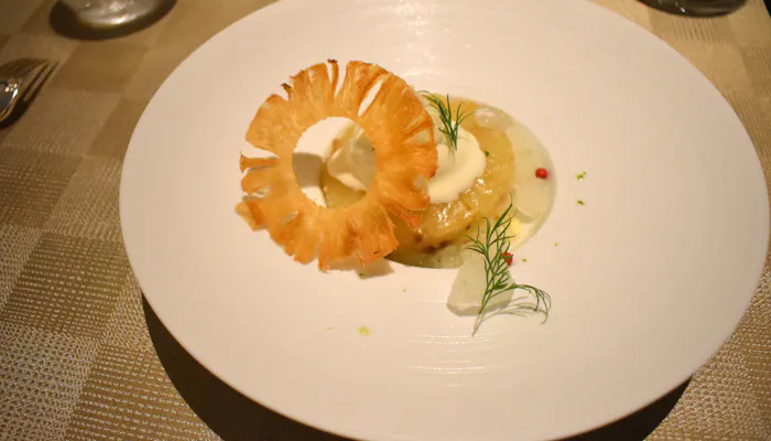旬のピーチパインを使ったデザート。濃厚なクリームチーズのアイスと、爽やかな甘みのピーチパインがよく合います。底には爽やかなライムのグラニテが敷き詰められていて、後味はすっきり。