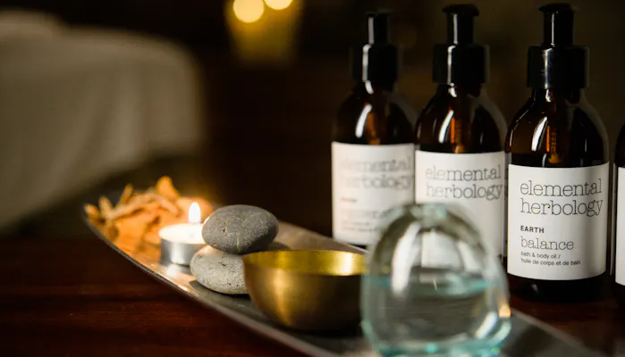 スパで提供されているのは、五行説に基づいたファイブエレメンツに合わせて行うトリートメント。カウンセリングシートをもとに掘り下げていくと、私は水分不足になりやすい「冬タイプ」で、「WATER」のエレメントを含むエッセンシャルオイルを使用することに。「エレメンタルハーボロジー」という、ファイブエレメンツの思想から生まれたイギリスのスキンケアブランドです。