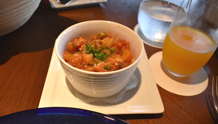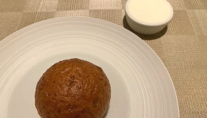 パンとバターの登場。こちらのバターは、ホイップクリームと通常のバターの中間のようなテクスチャーで、伸びがよいです。