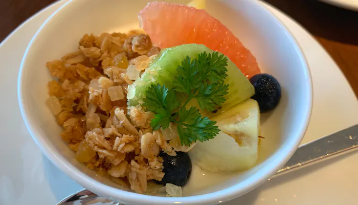 デザートの『旬のフルーツヨーグルト 南国グラノーラ』は、フルーツと合わせて食べると、丁度良い甘さでした。