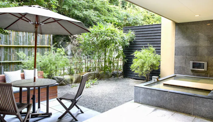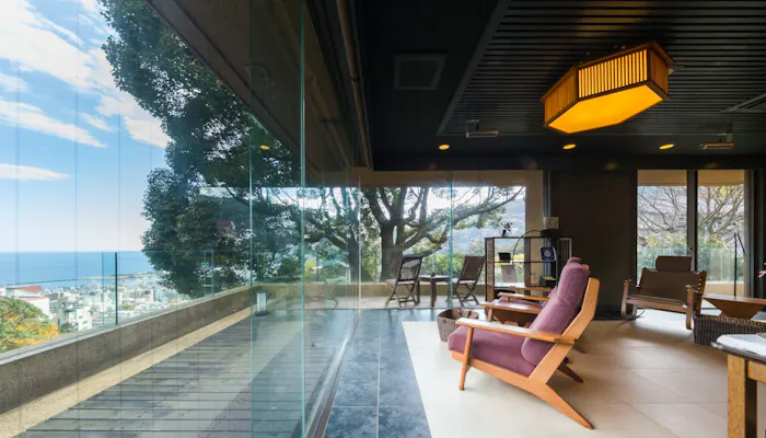 「ふふ 熱海」は、日本旅館ならではの温かなもてなしと、欧米ホテルのプライバシーを重視した滞在を叶えてくれる「RYOKANスタイル」の宿。26室すべてに露天風呂を設えており、お部屋で熱海の湯が楽しめます。