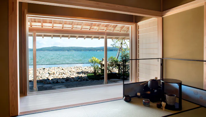 日本海を望む江差港のほど近くに建つ「旅庭 群来」は、専属の執事によるきめ細かな配慮が評判の大人のための温泉宿。離れのような配置でプライベートが確保された7室の客室には、天然温泉掛け流しの室内風呂を備えています。個室の食事処でいただく夕食は、江差で獲れた海の幸や、直営農場「拓美ファーム」の臭みのないサフォーク種羊肉など、地産地消を追求。オールインクルーシブなので、気兼ねせず料理とお酒のマリアージュも堪能できます。