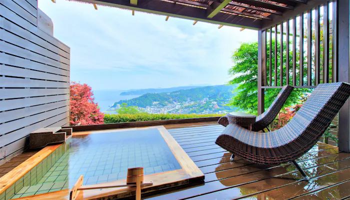 伊豆山の標高361mに位置する「ホテルグランバッハ熱海クレッシェンド」。露天風呂付きの客室では、開放感のある景色と源泉掛け流しの湯を独り占めする、贅沢な湯浴みが叶います。