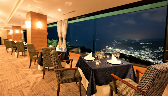 レストラン「Main Dining 風雅」では、煌びやかな夜景を傍らにディナータイムを過ごせます。熱海の素材が奏でる美しいハーモニーを、ダイナミックな景色と共に愉しんでみては。