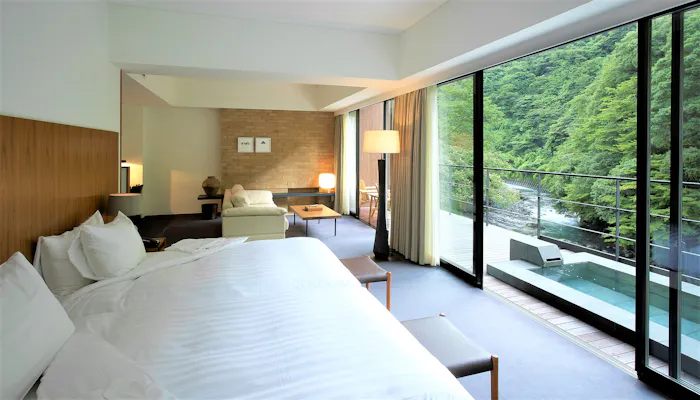 「arcana izu」は、大人が自然体でくつろげる森のオーベルジュ・リゾート。すべての客室には、源泉掛け流しの露天風呂が付いています。大きな窓の外に広がる豊かな森と川の音で、心が洗われるような気分に。