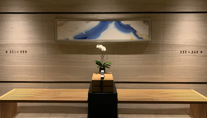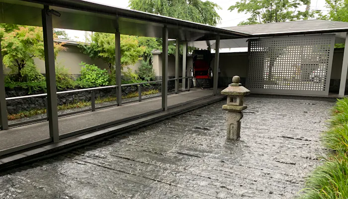 生憎の雨ですが、エントランスは水の流れる癒しの雰囲気で素敵です。