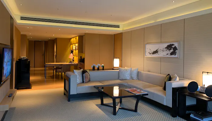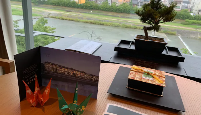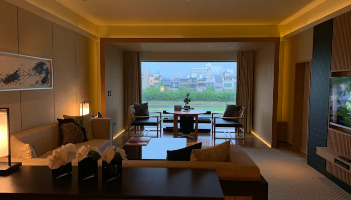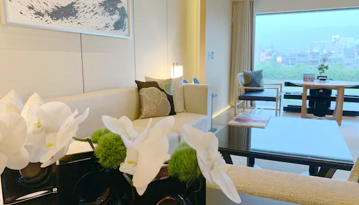 今回宿泊したのは、「スイートKAMOGAWA」。その名の通り、鴨川に面した126平米の広めのお部屋です。窓が大きくて開放感があります。