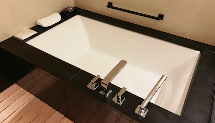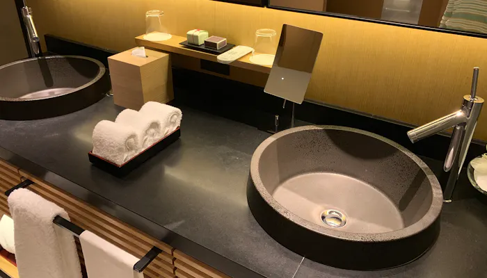 バスルーム。床に簀子があったり、壁に桜の浮き彫りがあったりと、さり気なく和の雰囲気を演出しています。