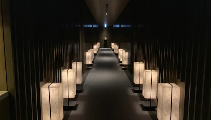 スパルームへ続く廊下を、和紙で作られた灯りが優しく照らします。