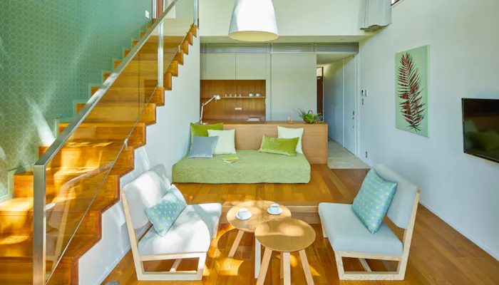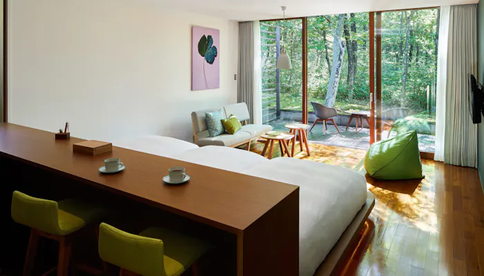 那須に生い茂る木々をイメージした「スーペリア」は、緑がテーマカラー。解放感抜群の大きな窓から望む生命力豊かな原生林と、心静かに対話を楽しめるお部屋です。