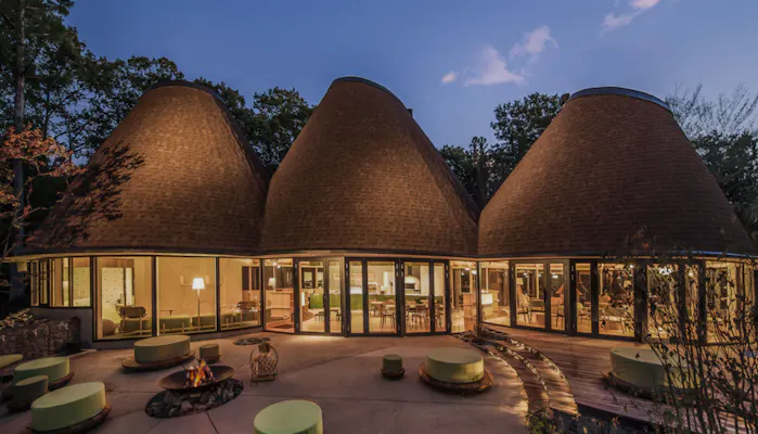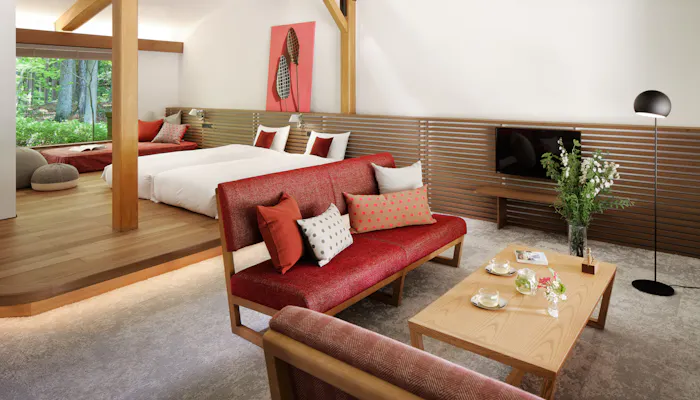 天然生林の合間を縫うようにして配された、全43室の客室からも新鮮なワクワク感を感じることでしょう。広大な敷地内は3つのエリアに分かれ、それぞれ違った景観を愉しめます。シンプルでスタイリッシュかつ、木をふんだんに用いた客室は柔らかで和める雰囲気。室内に、那須にゆかりのある草花をモチーフにしたデザインが施され、外の自然と緩やかな繋がりを感じられる工夫も施されています。