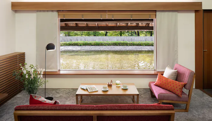 水庭に映る四季の風景を楽しんでほしいと名づけられた「ミナモトリプル」のテーマカラーは赤。屋外には、水面に映る自然を愛でる各客室専用ベンチも設えられています。