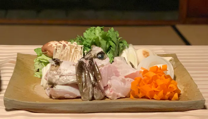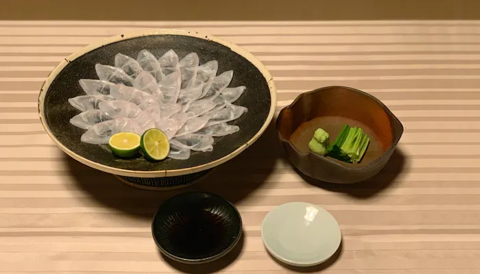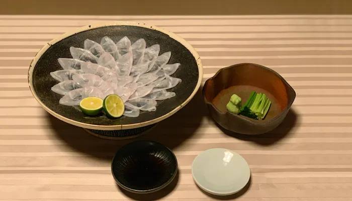 「洋々閣」の「アラ(クエ)づくし」では、肝、胃袋、エラをぽん酢でいただきます。特にエラは、下処理にとても手間がかかる部位。他のお店ではその手間さがゆえに、扱っていないところも多いそう。コリコリとした食感と肝のコクのある旨味が味わえる一品です。