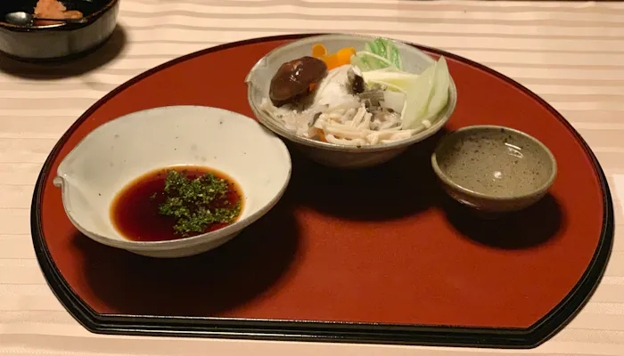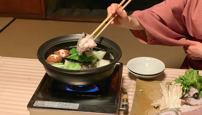 昆布で出汁をとり、仲居さんの手で鍋が作られていきます。