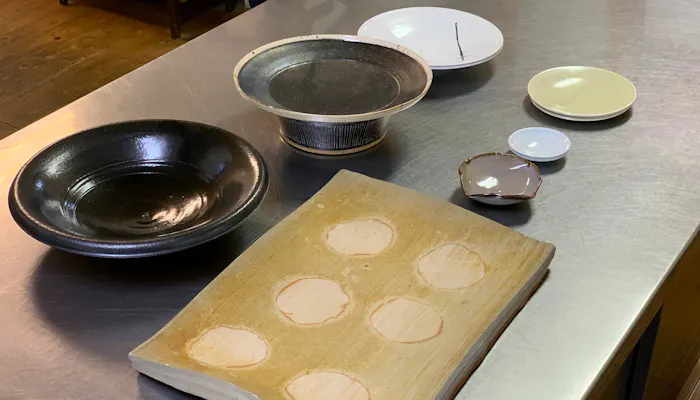 「洋々閣」の夕食の器は、唐津で生まれた名陶芸家・中里隆氏、そして子の太亀氏、花子氏、孫の健太氏の「唐津焼」が使われています。唐津の伝統も一緒に堪能してほしいというお宿の想いからだそう。