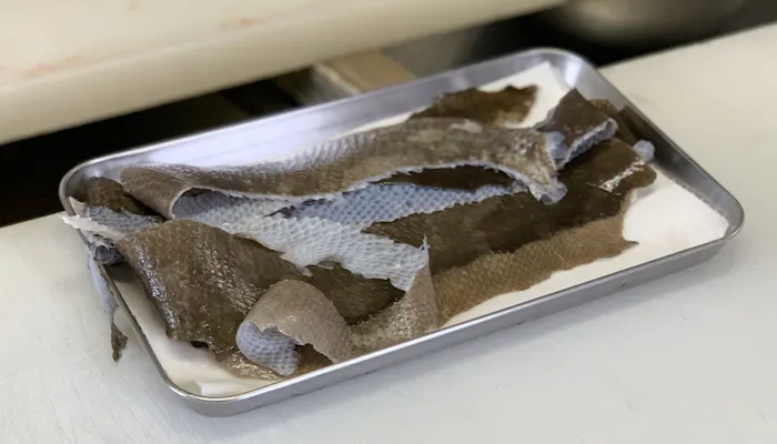 こちらが鱗のついた「クエ」の皮。油で揚げて、“鱗煎餅”としていただくそうです。