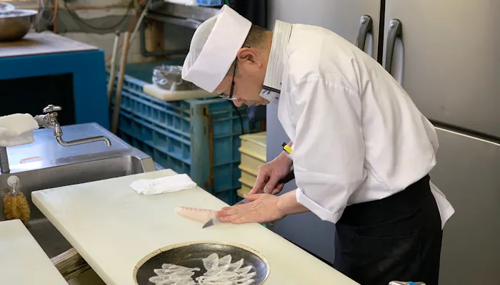 料理長の石川さんが、一つも無駄のない包丁さばきで、神経抜きをした「クエ」の皮をスーッと剥いていきます。