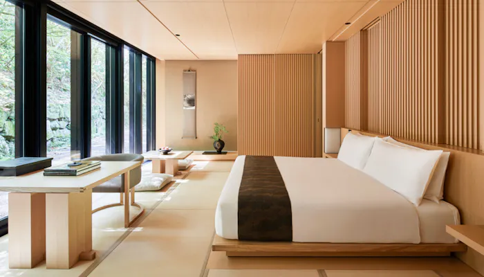 日本で3つ目のアマン「アマン京都」が誕生したのは、京都の中心地から少し離れた鷹峯にある静かな森の庭。自然に恵まれた環境の中、周囲の景色に溶け込むように、宿泊棟やレストラン棟、スパ棟などが点在しています。アマン京都オリジナルデザインの家具を設えた26室の客室は、日本旅館をベースにしたモダンな造り。窓の外に見える景色が、シンプルな空間に彩りを添えています。
