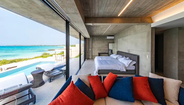 1日3組限定の「D’sgrow resort Infinity Pool Villa TOGUCHINOHAMA」は、全室が文句なしのオーシャンフロント。リビングや寝室、浴室、1年中楽しめる温水のプライベートインフィニティプールからも、沖縄屈指の美しさを誇るビーチを見渡せます。天気の良い夜には、満天の星空に出会えるのも楽しみのひとつ。贅を尽くした空間で、ラグジュアリーなリゾートステイを満喫しましょう。