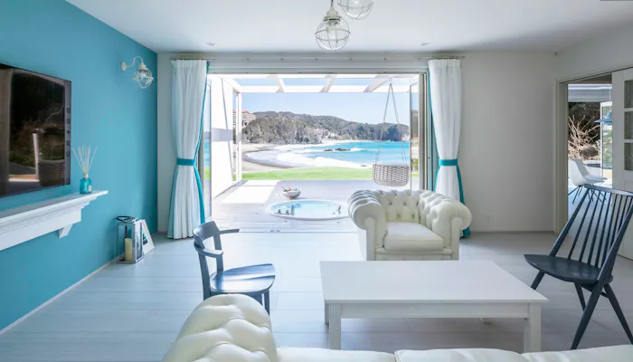 伊豆の中でも特に透明度が高い入田浜。「Aquaholic Iritahama」は、白い砂浜と青く透明な海の目の前に2019年4月に誕生しました。白を基調にインテリアをブルー系の配色でコーディネートしたエレガントな空間は、海外ドラマのワンシーンのよう。バルコニーのジャグジーは、リゾート気分を高めてくれるのはもちろん、ビーチから戻ってすぐに体を温められます。