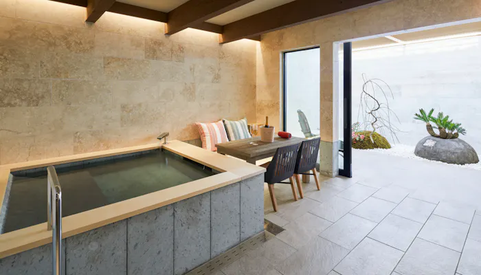 京都市中、御所東に位置する「suki1038 御所東」。京町家の外装や空気感を残しつつ、リゾートのテイストを加えてリノベーションしたスモールラグジュアリーな宿です。特筆すべきは、開放的でダイナミックな浴室。100平米を超える「壱」にある、リビングダイニングを兼ねた半露天風呂付きの大空間は、圧倒的な贅沢感で非日常のリゾートステイを体験できます。