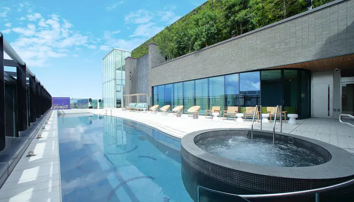 博多駅筑紫口のすぐ目の前という好立地な場所にオープンした「都ホテル 博多」。「緑と水と光のホテル」をコンセプトに、多彩なグリーンを施設内外に立体的に配置し、自然を感じさせる新感覚のシティホテル。最上階に備わる屋上スパ「ルシーダ」は、敷地内で汲み上げた天然温泉が満たされているプールやジェットバスなどが備わっており、海外リゾートのように水着で楽しめます。