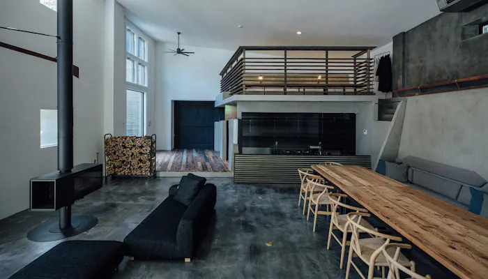 客室は2室。1階「TERRACE SUITE」は、天井まで5mと高く、1階とは思えない開放感。落ち着いたダークトーンのインテリアがリラックス感を醸し出します。客室から、300平米の広さを誇るガーデンテラスへ直接アクセスできるのも嬉しいですね。リビング中央に鎮座する薪ストーブが、さらにリゾート気分を盛り立てます。広々としたソファエリアのほか、大きなダイニングテーブル、ごろりと寛げるクッションエリアなど、どこでも団欒を愉しめそう。