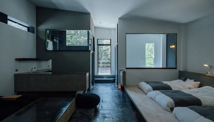 2階「BALCONY SUITE」は、ソファやリビングダイニング、キッチン、バスルームなどが揃ったシンプルかつスタイリッシュな客室。40平米と広々としたバルコニーは、森の中に居ることを感じさせてくれる素敵な場所。目の前にそびえる背の高い樹々の緑と対話するような、不思議な心地よさが味わえるでしょう。