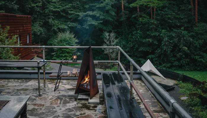 都会では味わえない“静寂”に包まれる体験が叶うのも、森の中に在るリゾートならではの魅力。1階、2階それぞれに設置された焚火台で、樹々のささやきや鳥の歌をBGMに、炎を眺め心鎮まるひとときを過ごすのも素敵な時間です。