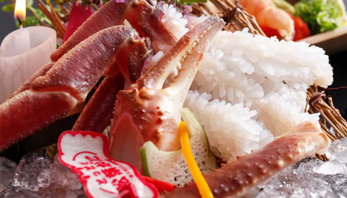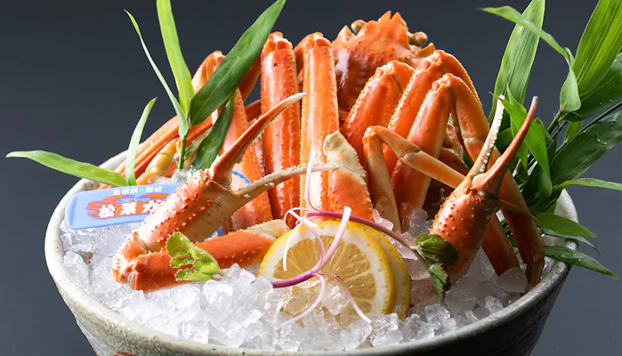 毎年11月からは、様々なバリエーションのカニプランが登場。なかでも「特選活松葉蟹」は、地元境港、賀露港をはじめ、近隣の漁港で水揚げされた新鮮な活松葉ガニのみを使った「本生松葉蟹づくし」のプランです。茹でガニ1枚、カニ刺し、焼きガニ、カニスキ、カニ雑炊と、赤タグ付の活け松葉ガニをお一人様2杯分。まさにカニ三昧の贅沢ステイが叶います。