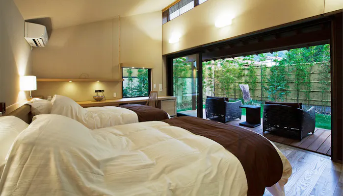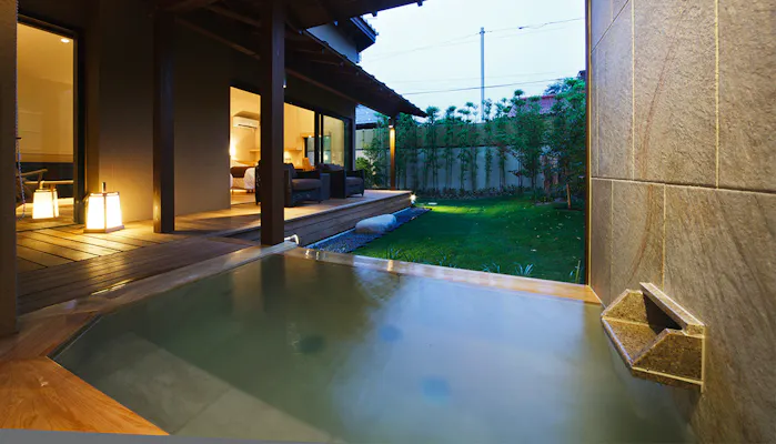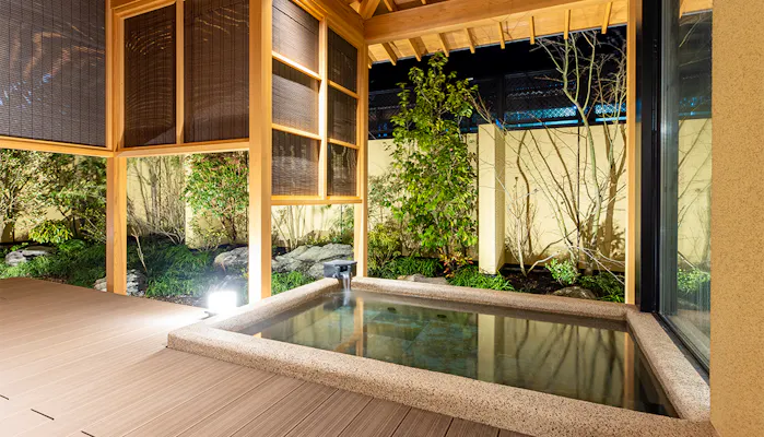 「橋津屋 別邸 月代」は、世界屈指のラジウム温泉で知られる三朝温泉で300年以上続く老舗宿「橋津屋」の別邸。僅か2室の客室は、石州瓦が葺かれた瀟洒な佇まいの離れ。寝室、和室、広々としたテラスなどを備えた贅沢な間取りで、浴室には三朝温泉を湛えた露天風呂と内風呂を備えています。