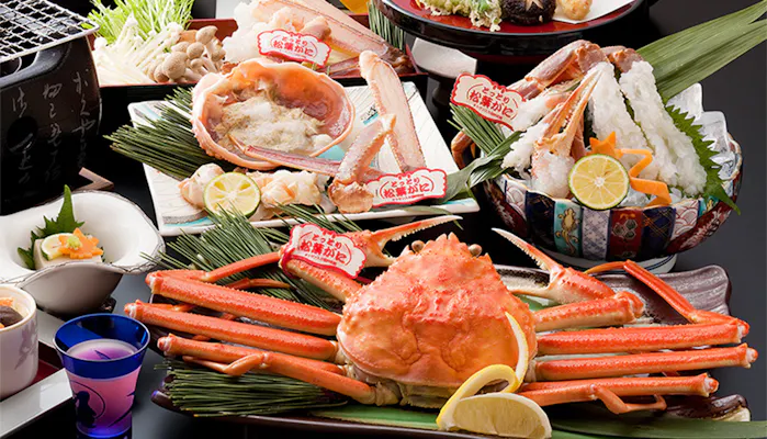松江藩主・松平不昧公ゆかりの皆美家伝「鯛めし」をはじめ、山陰の恵みを伝統の味で仕上げる料理にも定評のあるこの宿。11月上旬から2月末 までは、活松葉ガニを入れた「かにづくしプラン」を販売しています。酢ガニ・焼ガニ・カニ刺しなど様々な調理方法で、山陰を代表する冬の味覚を味わい尽くしましょう。