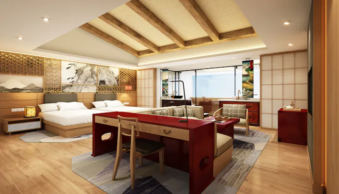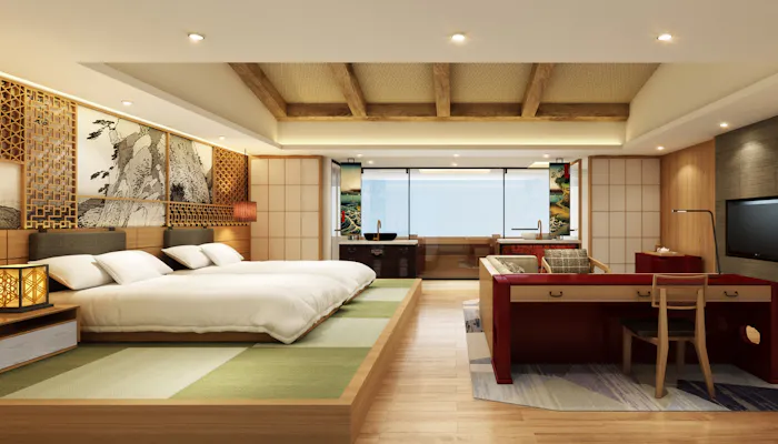 その中でもぜひ泊まってみたいのが、最上階の「1ベッドルームプレミアスイート 」。ちょっとのぞいてみるとここにも寄木細工が。広さは64平米。日本画がデザインされたヘッドボードや障子、組子の行灯など、和の情緒たっぷり。箱根らしさもたっぷりです。