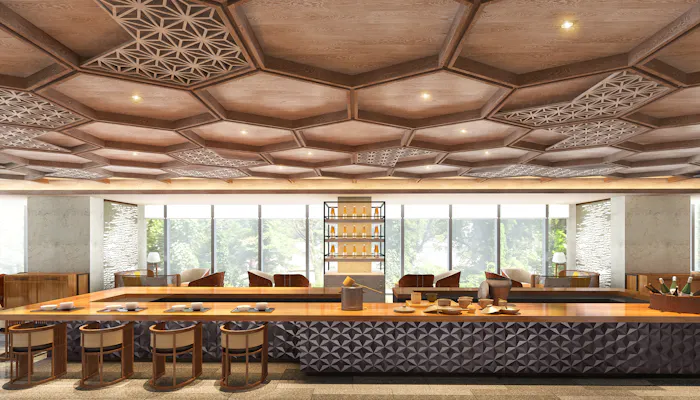 箱根の緑に埋もれるように立つ4階建てのシックな外観。館内は、箱根に200年ほど続く伝統工芸・寄木細工を多用した空間です。樹種も色もさまざまな木々を、麻の葉に、市松に、矢羽根模様に納めた寄木細工は、ロビーに限らず、レストランやバー、スパ、大浴場にも! ロビーには囲炉裏も設けられていて、暖かな温もりがあふれるデザインです。