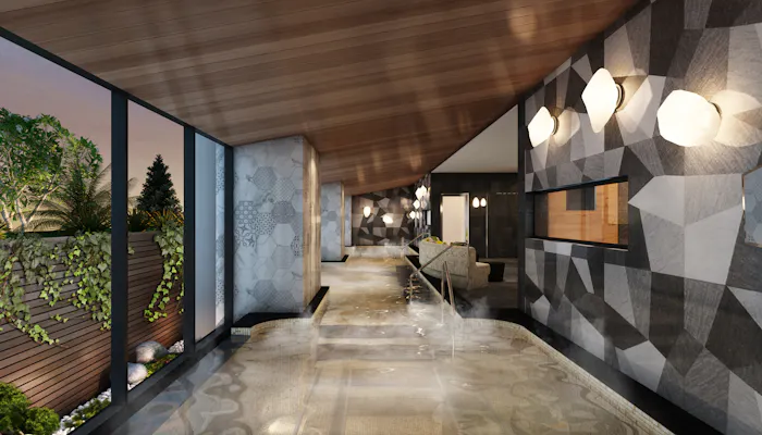 欧米を中心に展開してきただけあって、ジムや温泉利用のリラクゼーション施設が充実しているのも特徴です。屋内大浴場は混浴。水着着用での利用となります。強羅の温泉とモダンなプール、両者の良いとこどりをした形で、これならカップルで訪れてものんびりと楽しめそう。