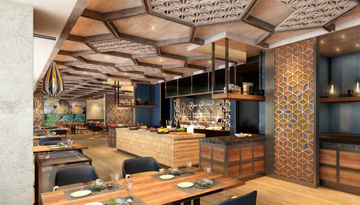 食事はすべてオールデイダイニングレストラン「リバーサイド キッチン&バー」で。このレストランのテーマは活火山やエネルギーなどを意味する「火」。薪オーブンで作る熱々料理などもあり、箱根ならではの食体験が叶います。