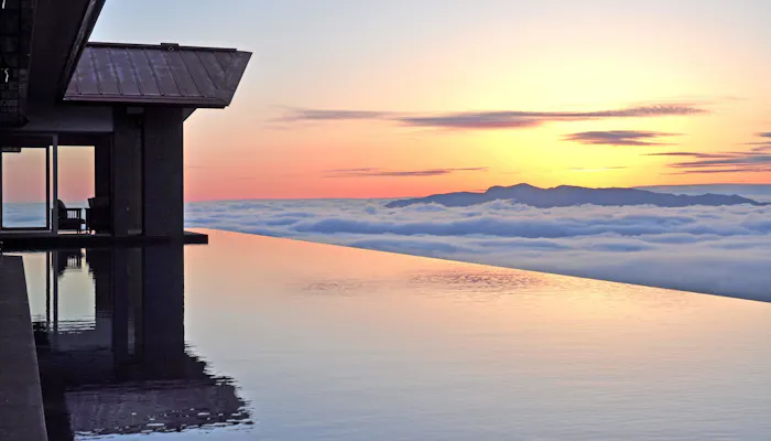 妙高山の中腹、標高1,000メートルに位置し、本格的な高原リゾートホテルの草分け的存在として知られる「赤倉観光ホテル」。SPA&SUITE棟の最上階にある「アクアテラス」では、水盤越しに山々を望み、季節によっては雲海に出会えることも。雲の上に広がる絶景は、写真に収めずにはいられません。