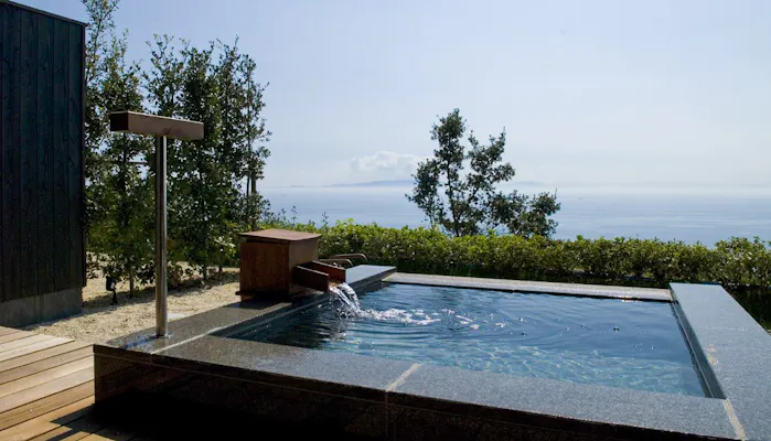 全20室に絶景の客室露天風呂がありながら、大浴場も2つ。それぞれに露天風呂とサウナがあり、露天風呂は自然と一体になるような気分で入浴できる“インフィニティ風呂”。水平線の向こうに箱根連山を眺める湯浴みは、まさに至福のひとときです。