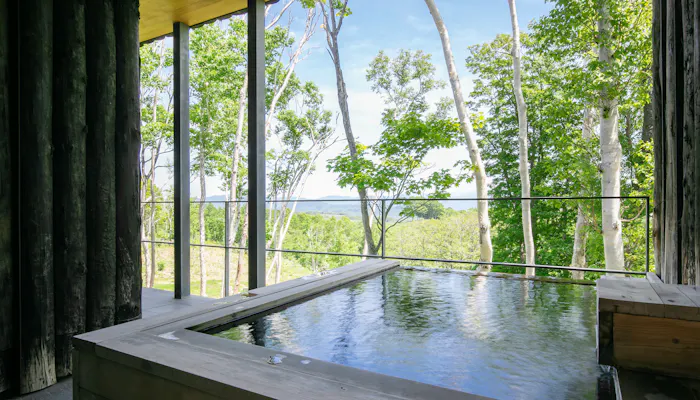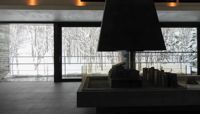 「坐忘林」があるのは、羊蹄山とアンヌプリ連山に囲まれ、豊かな自然に恵まれた北海道・ニセコ。館内は大自然の魅力を引き込むように設計され、ロビーやラウンジ、バーなどの至るところで四季折々の美しい風景を見ることができます。