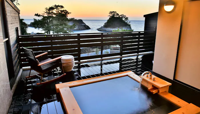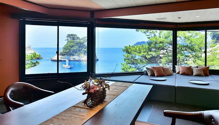 メインルームは、温泉露天風呂で寛ぎながら、水平線や島陰に沈む夕日を眺めることができるお部屋。ダイニングルームのあるセカンドルームは、堂ヶ島の海や島々をより近くに感じられます。計150平米の贅沢な空間で、ここだけの絶景を満喫しましょう。