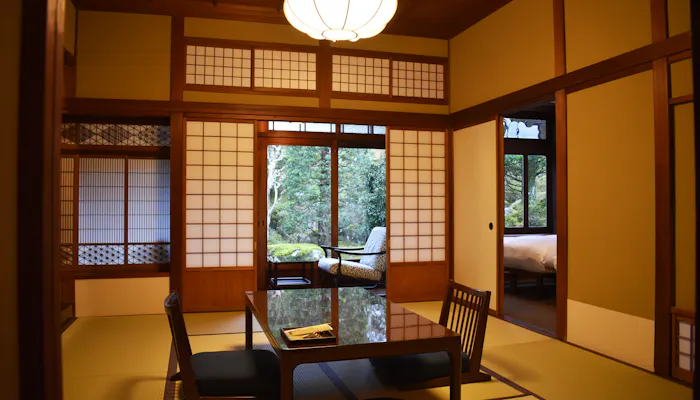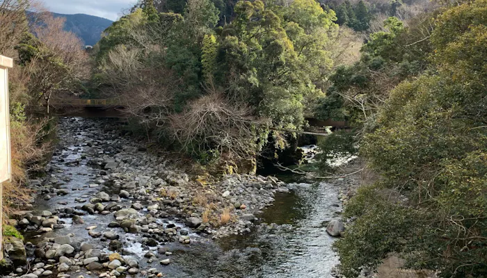 伊豆半島を流れる本谷川と猫越川が重なる地に建つ「おちあいろう」。江戸無血開城の立役者・山岡鉄舟により、“川が落ち合う”ということで名付けられたという歴史ある宿です。夏になると蛍が舞い、宿の前の橋では蛍祭りも開かれるそう。