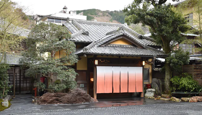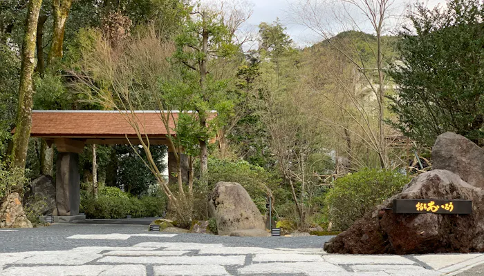 杉の皮を5千枚使用した門の屋根の裏には見事な流木。鹿児島県の河川で見つかった楠の埋れ木の古木が使われ、くぐらないとわからない造りに、職人の遊び心を感じます。2019年にリニューアルした創業約145年の老舗旅館は、宿に入る前から非日常体験への期待値をあげてくれます。